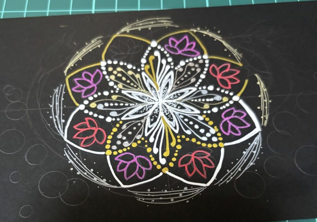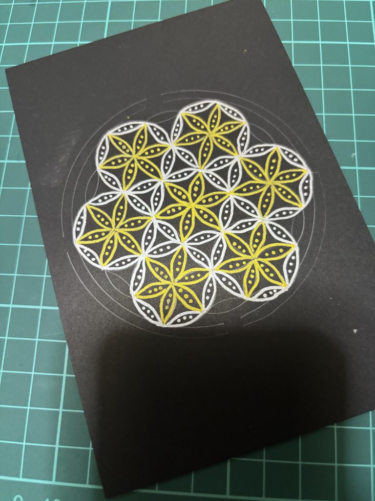 描き進めるうちに思いがけない線や色が生まれ、前回とは全く違う曼荼羅になることも。皆さん真剣に向き合い、繊細で個性的な作品が次々と生まれました。世界にひとつだけの曼荼羅は、ぜひお部屋に飾ってお楽しみください。